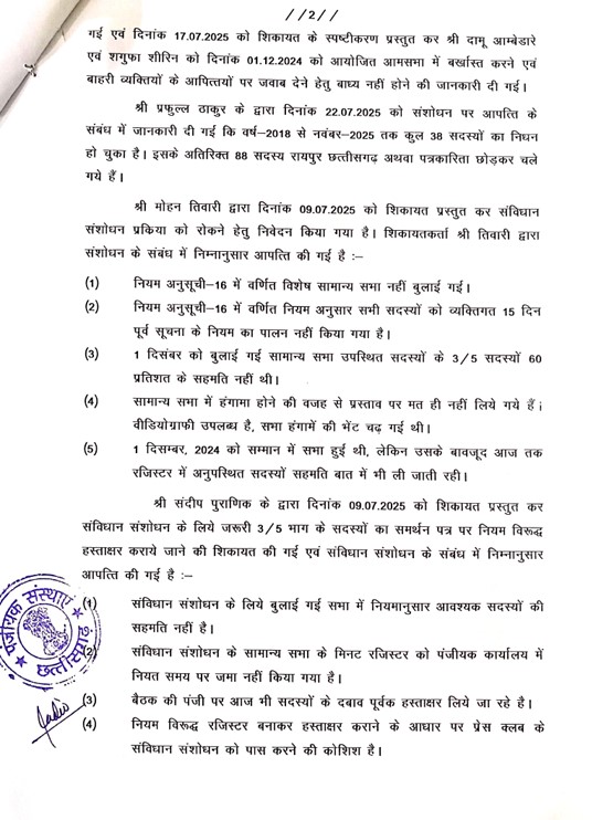 रायपुर hct : राजधानी के बहुचर्चित प्रेस क्लब रायपुर में लंबे समय से चुनाव टाले जा रहे थे। कार्यकारिणी का कार्यकाल 17 फरवरी 2025 को ही समाप्त हो चुका था, लेकिन पदाधिकारी कुर्सी से चिपके रहे। इस दौरान कार्यकाल बढ़ाने और संविधान में संशोधन करने की कवायद भी की गई। 1 दिसंबर 2024 को बुलाई गई सामान्य सभा का हवाला दिया गया, लेकिन उसमें न तो 3/5 बहुमत हासिल था और न ही बैठक बुलाने की वैधानिक प्रक्रिया पूरी हुई।