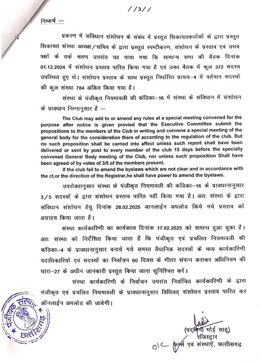 आदेश में कहा गया है कि संविधान संशोधन और कार्यकाल विस्तार का प्रस्ताव नियमानुसार पारित ही नहीं हुआ। 15 दिन पूर्व सूचना का नियम नहीं माना गया, कार्यवाही का मिनट्स रजिस्टर जमा नहीं हुआ और न ही सदस्यों की सहमति प्राप्त की गई। इसलिए कार्यकारिणी का कार्यकाल स्वतः समाप्त मानते हुए 60 दिनों के भीतर चुनाव कराने का निर्देश दिया गया।