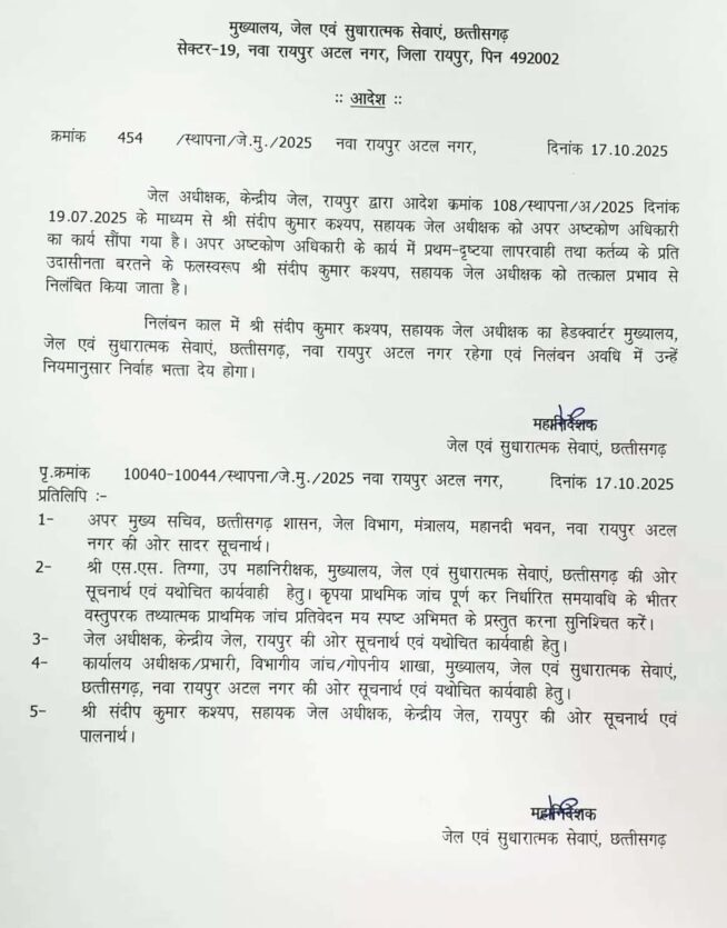 मामला सामने आते ही जेल अधीक्षक और दो सिपाहियों को लापरवाही और मिलीभगत के आरोप में निलंबित किया गया, लेकिन कार्रवाई को सिर्फ दिखावे की कवायद माना जा रहा है।