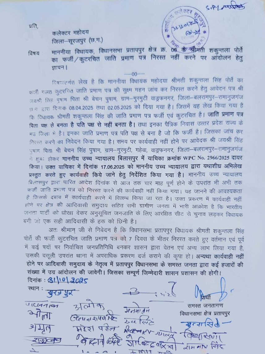 सरगुजा hct : छत्तीसगढ़ के प्रतापपुर विधानसभा क्षेत्र में विधायक शकुंतला सिंह पोर्ते के जाति प्रमाणपत्र को लेकर नया विवाद खड़ा हो गया है। आरोप है कि यह प्रमाणपत्र वैधानिक दस्तावेजों के अभाव में जारी किया गया। यानी न पिता के दस्तावेज, न खुद के प्रमाण, पर जाति का प्रमाणपत्र तैयार। अब आदिवासी समाज ने इसे “कागज़ी आदिवासीकरण” का नमूना बताते हुए कार्रवाई की माँग तेज़ कर दी है।