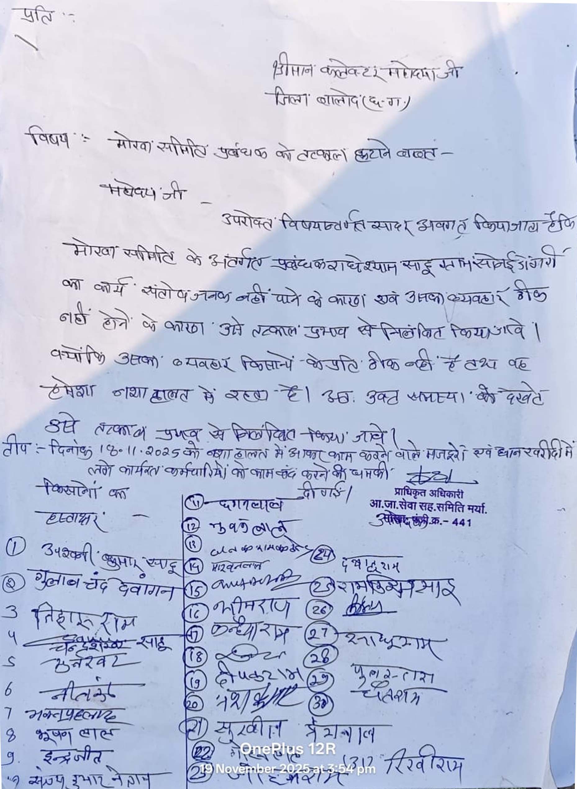 मोखा सहकारी समिति में असंतोष, प्रबंधक को हटाने कलेक्टर से मांग।